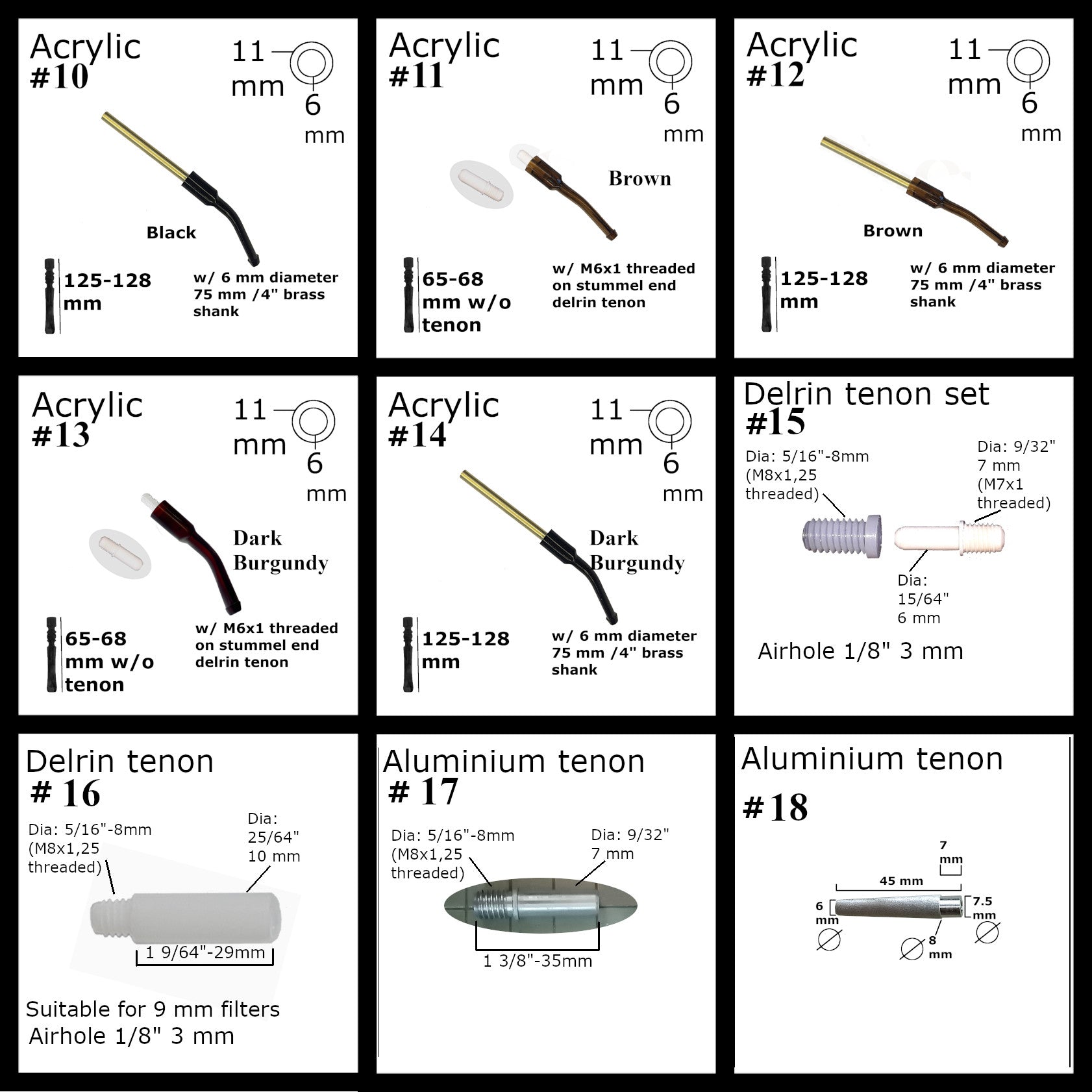 Every piece can be used for briar, meerschaum or other pipes. All mouthpieces ready to use but can be benefited a final buffing to shine. Metal parts aren't coated.